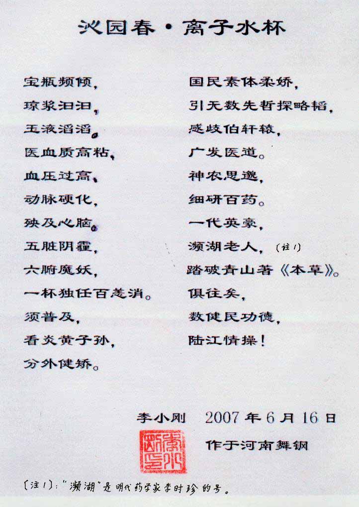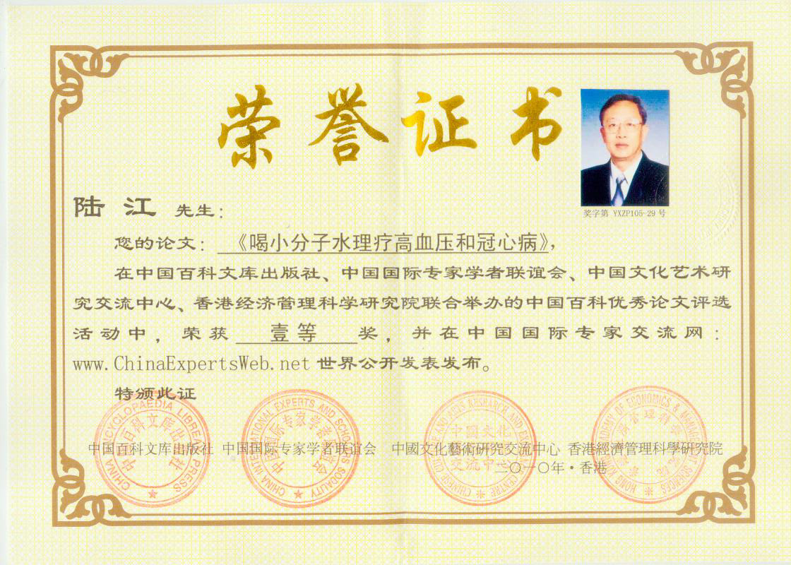 -----我是從事建筑的高工,本來沒有資格去攻克醫(yī)學(xué)難題,卻為了自身健康才扣響醫(yī)學(xué)的大門。由于我1990年患高血壓,因怕中風(fēng)才研究發(fā)明了離子水瓶,我把水處理成微小分子團(tuán)水,飲用后治愈了高血壓。便于1993年底送到三家省級醫(yī)院做臨床試用4個(gè)月。經(jīng)北京和廣西醫(yī)學(xué)專家鑒定:"降脂降壓效果好"," 能擴(kuò)大心腦動脈流量,改善心腦電圖以及微循環(huán)","對治療心腦動脈粥樣硬化、高血壓、高血脂有良好的醫(yī)療保健作用。""產(chǎn)品的技術(shù)性能和療效達(dá)到了同類產(chǎn)品的國內(nèi)領(lǐng)先水平,經(jīng)廣西醫(yī)學(xué)科學(xué)情報(bào)研究所檢索,未見國外有類似報(bào)道。"中國醫(yī)學(xué)科學(xué)院張正國教授從美國國立醫(yī)學(xué)圖書館數(shù)據(jù)庫存Medline檢索英俄文資料,均未見類似報(bào)告。2000年上市后,我為了對消費(fèi)者負(fù)責(zé)而繼續(xù)觀察研究,一直通過《信譽(yù)卡》和《質(zhì)量跟蹤調(diào)查書》向患者承諾療效,請用戶使用6個(gè)月后反饋效果。和脂壓患者飲用2至5個(gè)月內(nèi),消除癥狀,停服藥物,血壓正常;冠心病患者飲用3~5個(gè)月逐漸減輕至消除心絞痛、房顫等癥狀,不再服藥,飲用1年左右心電圖正常,經(jīng)冠脈造影掃描無明顯狹窄,表明冠心病痊愈。大量患者還反映許多衰弱器官被修復(fù),讓前列腺增生、慢性咽喉炎、慢性氣管炎、支氣管炎、慢性胃炎、腸炎和膽囊炎等不藥而愈;2型糖尿病患者是因?yàn)橐葝u衰弱致病,飲用該水半年至一年,逐漸減藥至停藥,血糖尿糖正常,真正治愈2型糖尿病。中風(fēng)后遺癥患者飲用六七個(gè)月,可逐漸減輕至消除肢體和語言障礙,表明飲用該水能讓壽命很長的神經(jīng)元細(xì)胞逐漸修復(fù),奇跡般地恢復(fù)肢體和語言功能。飲用后還使胸腺和脾臟兩個(gè)重要的免疫器官被修復(fù)和增強(qiáng),產(chǎn)生免疫細(xì)胞多,提高了免疫力,使人不生病或少生病。自此, 飲用微小分子團(tuán)水創(chuàng)造了攻克冠心病、高(低)血壓和糖尿病三大醫(yī)學(xué)難題的奇跡。人們對此感到不可思議,但實(shí)踐是檢驗(yàn)真理的唯一標(biāo)準(zhǔn)。